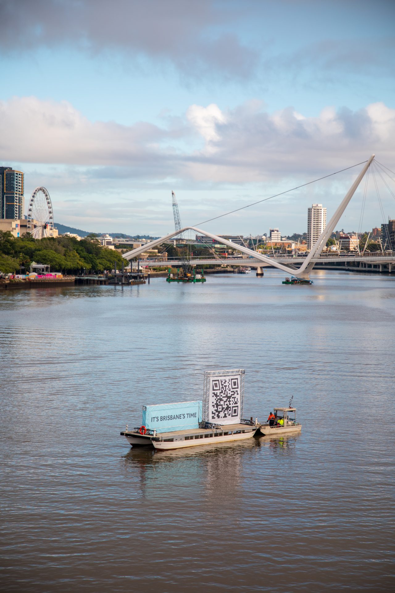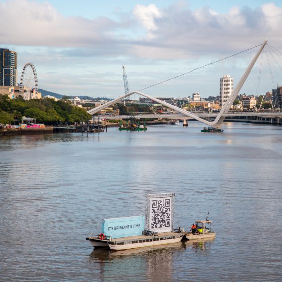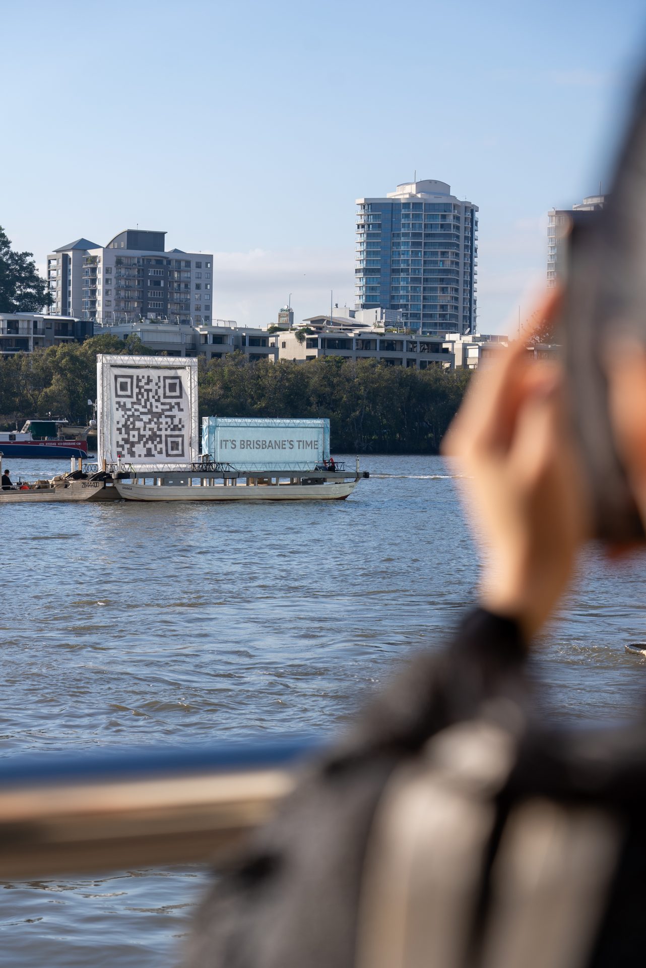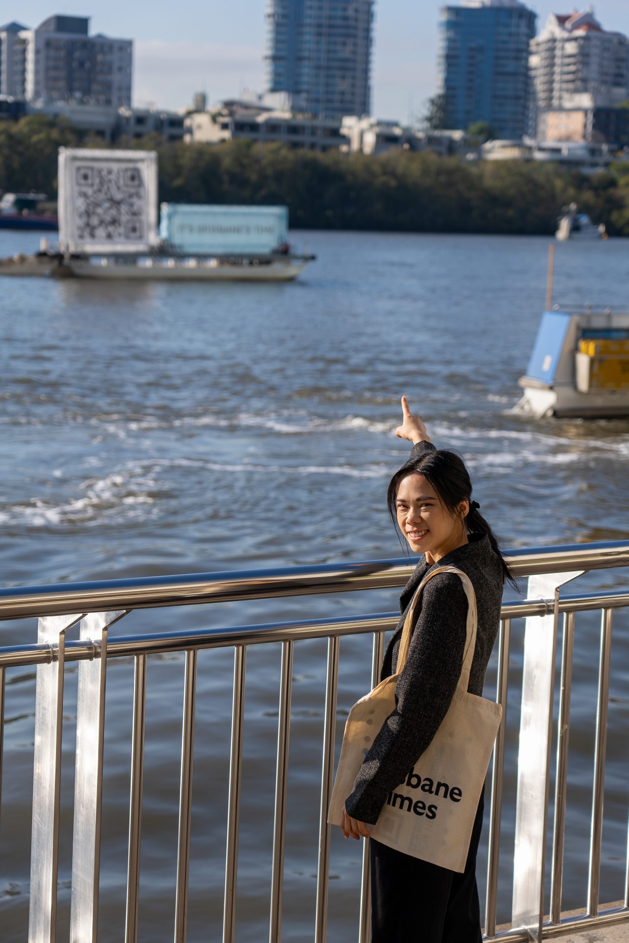 Our activation had two key components. First, a 4m x 4m QR code floated along the Brisbane River for seven days, making stops at strategic locations including Eagle Street, Goodwill Bridge, South Bank, and Howard Smith Wharves. These stops offered pedestrians, commuters, and ferry passengers an up-close view of this captivating spectacle. The QR code linked directly to Brisbane Times’ updated website, showcasing their enhanced content to potential subscribers in real-time.
