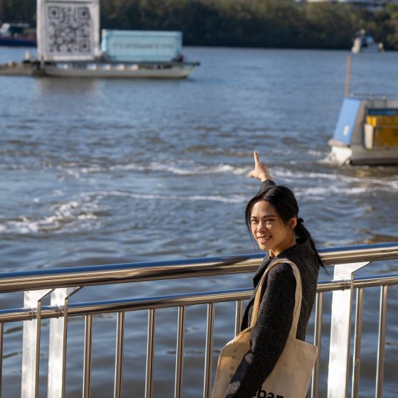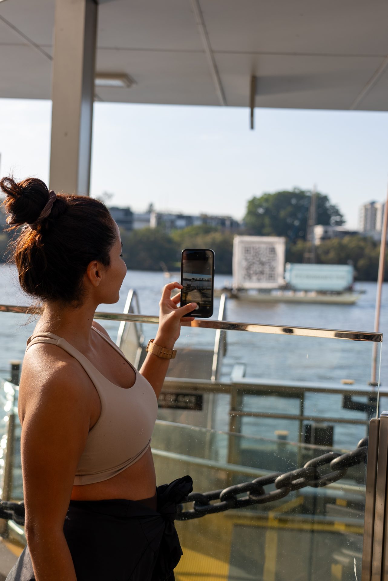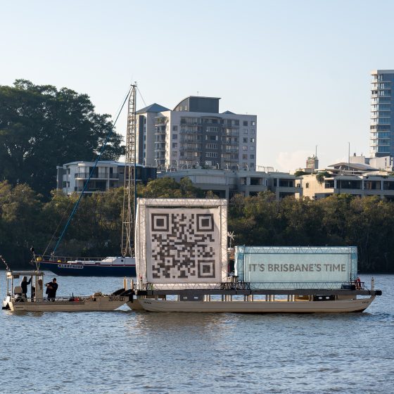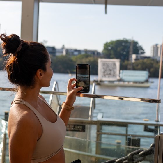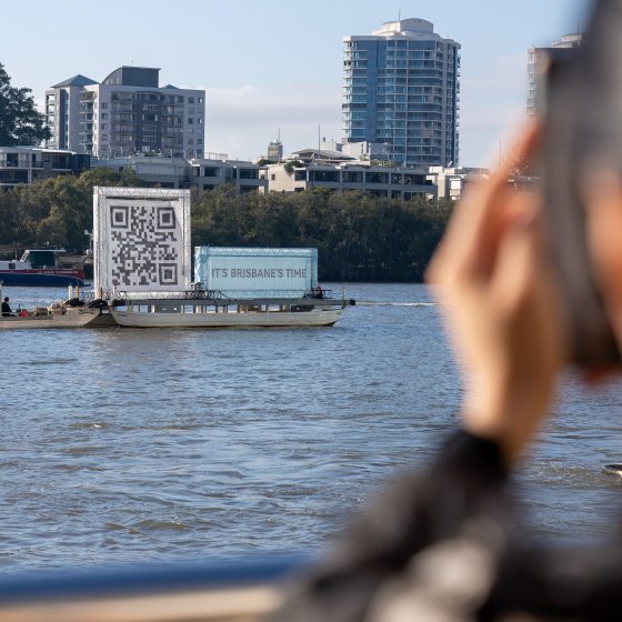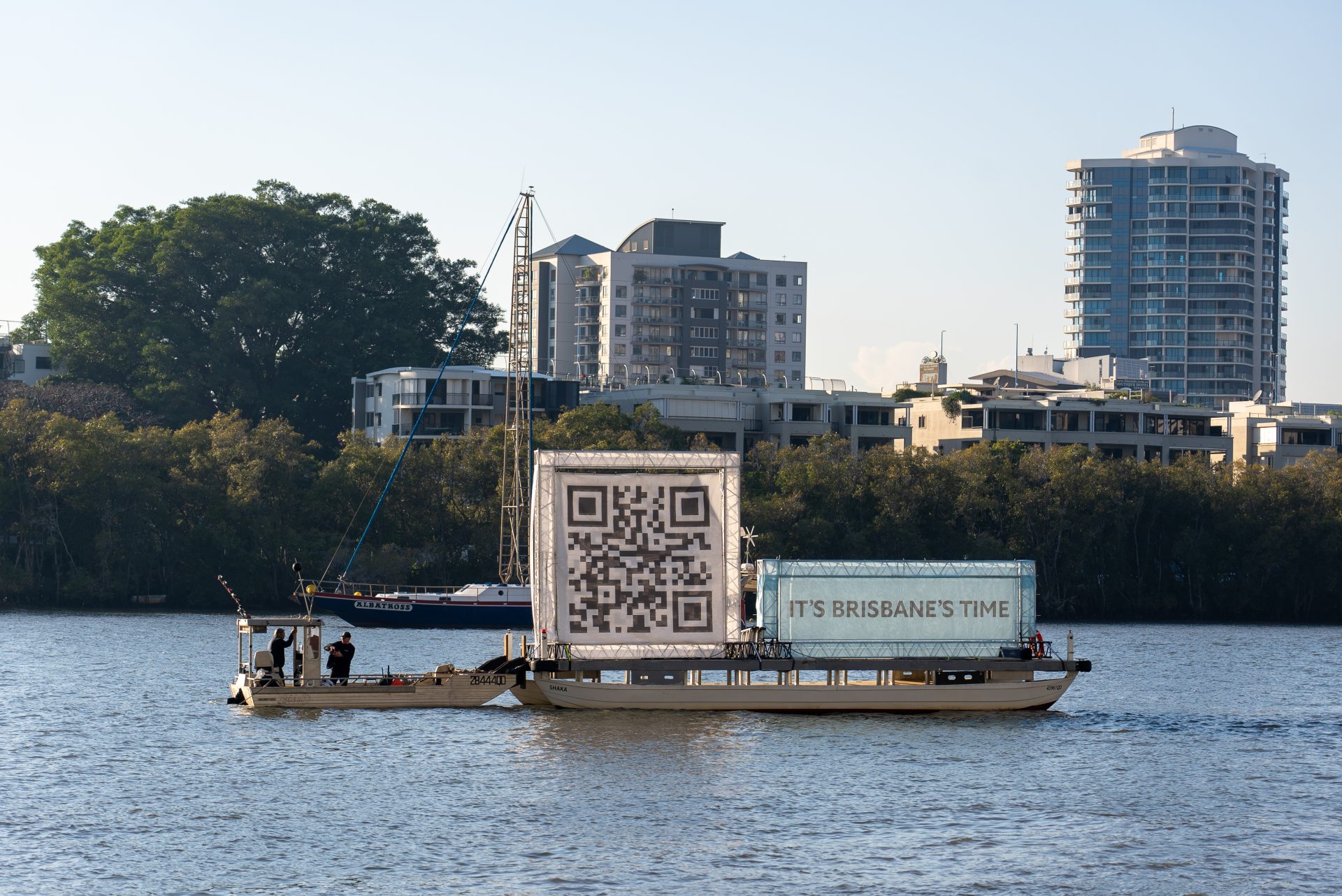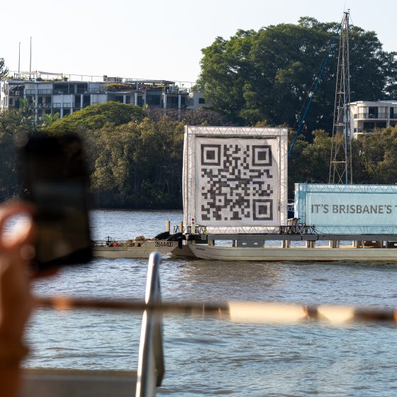 Our activation had two key components. First, a 4m x 4m QR code floated along the Brisbane River for seven days, making stops at strategic locations including Eagle Street, Goodwill Bridge, South Bank, and Howard Smith Wharves. These stops offered pedestrians, commuters, and ferry passengers an up-close view of this captivating spectacle. The QR code linked directly to Brisbane Times’ updated website, showcasing their enhanced content to potential subscribers in real-time.