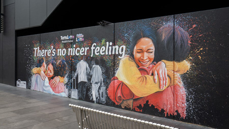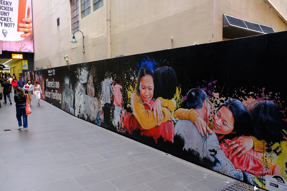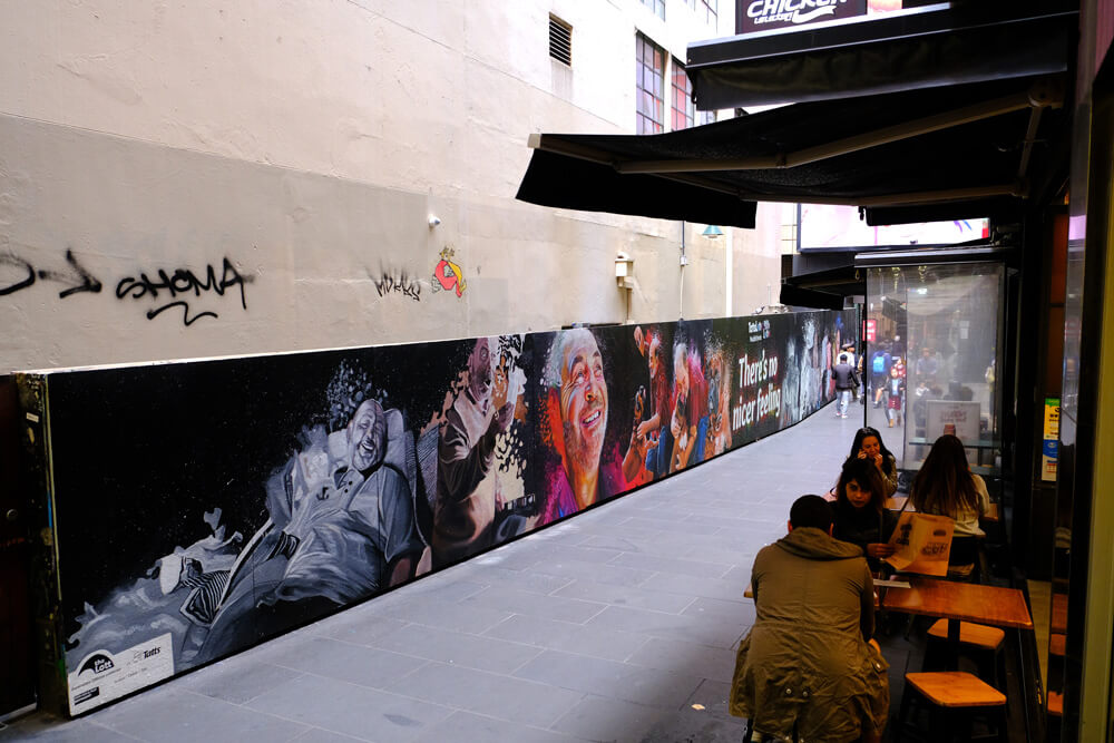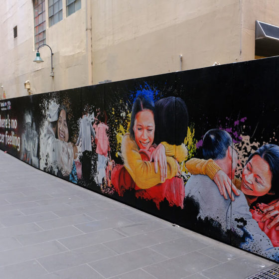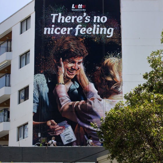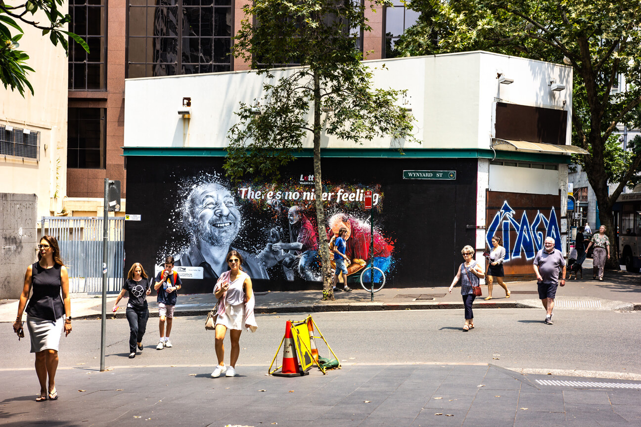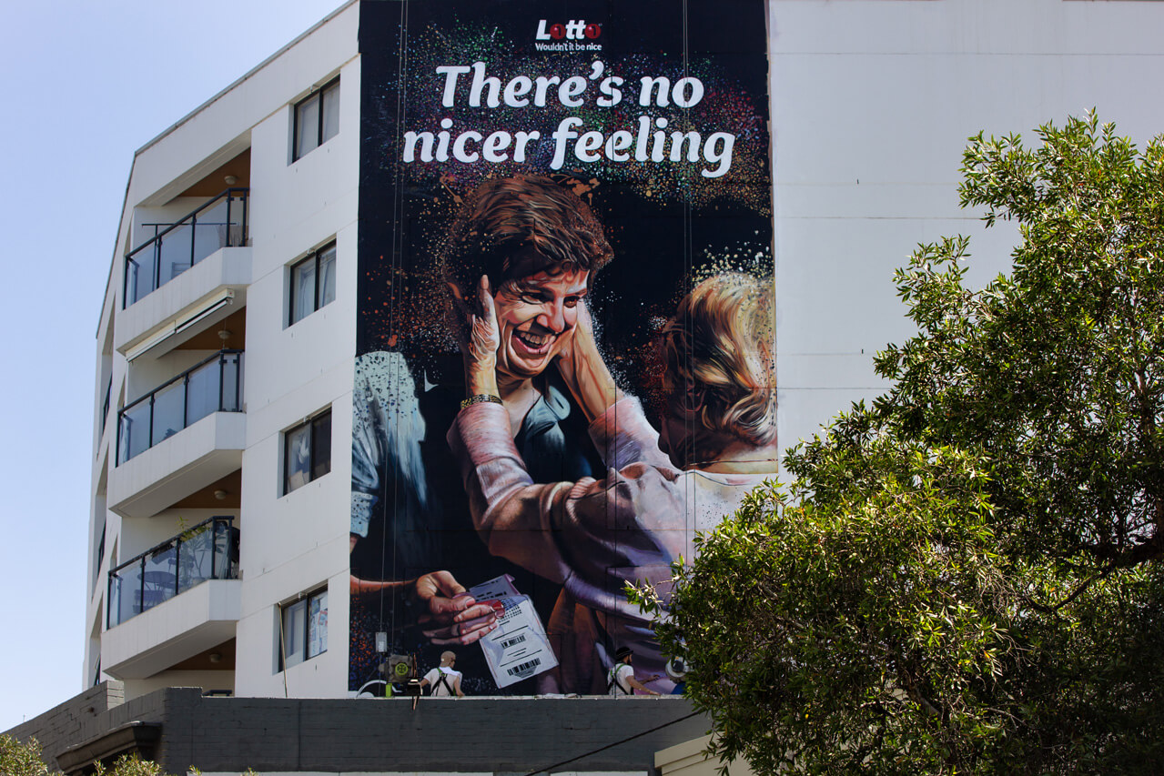 Lotto were looking to bring to life their newest TVC campaign through impactful murals. The designs for the murals were to include realistic portrayals of the characters as they transform from black and white to colour. As a national campaign, mural locations were needed to be found in Brisbane, Sydney and Melbourne targeting heavy-foot traffic locations.